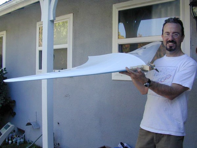 This model was finally flown successfully on March 29, 2007. It was a great relief to see it fly. The first flight went very well. Control response was excellent, power seemed more than adequate. It was certainly fast! Landing was a challenge, as it always is with this model. I had to go around once because the first time I was coming in way too hot. It flipped over on landing because I didn't slow it down enough, it took time to develop the proper technique. There was some minor damage to one of the elevons, but I was nonetheless overjoyed that she finally flew!