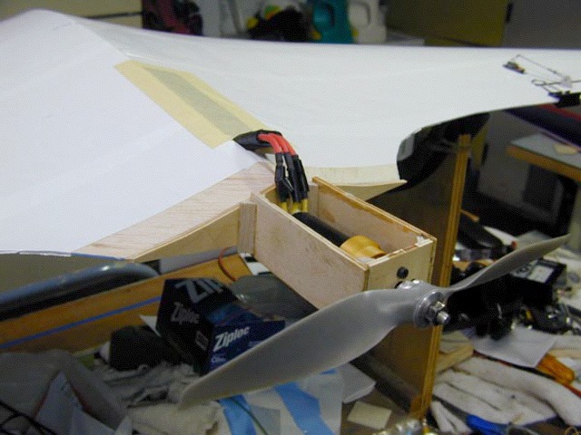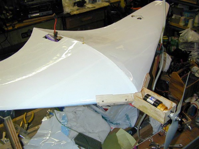 Armed with that knowledge, I set about converting the model to a pusher. I chopped off the aft portion of the bat tail and made a firewall capable of supporting the motor.